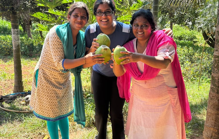 Watching coconuts being brought down from towering palms reminded me how much skill and courage goes into everyday rural labor. It taught me that what we take for granted in our supermarkets comes from human effort. They judged which coconuts were ready not by tiny cues like weight, shell temperature, the sound of water shifting inside. One of them showed me how each stage of maturity changed the flavor and purpose: younger coconuts for hydration, slightly older ones for meat, and the mature ones reserved for oil or cooking.